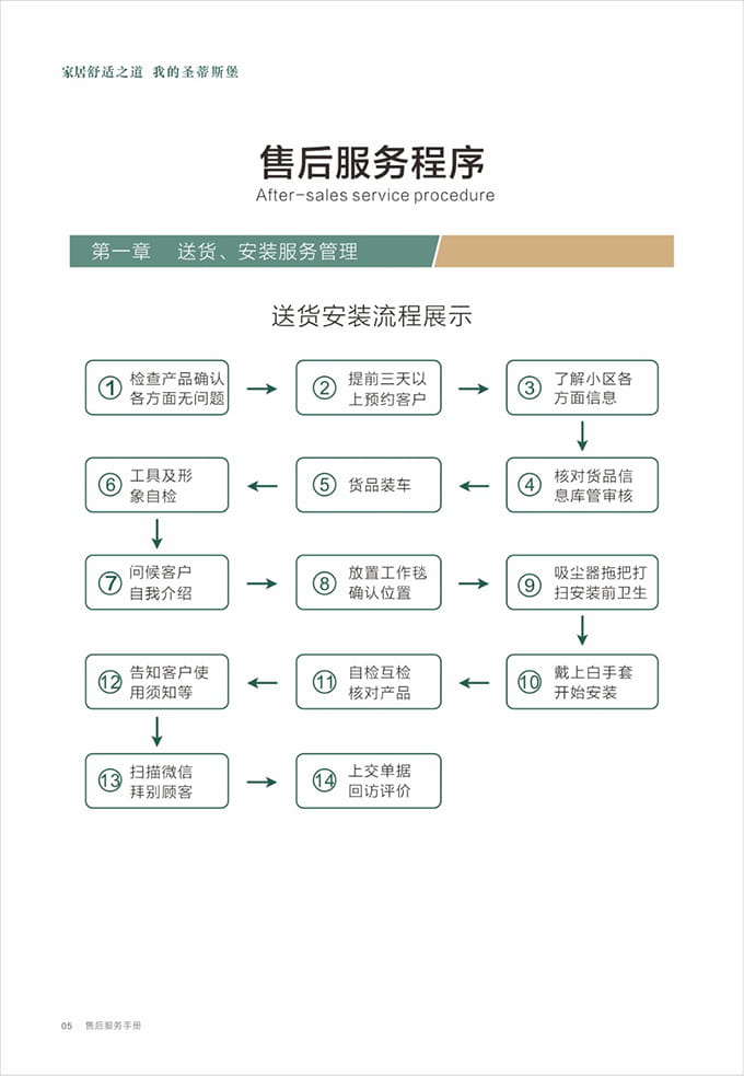 告别之前:告知客户OD综合体育全国免费服务电话(售后服务贴)以及保修方式,请客户在《产品配送单》上签名,并填写《配送满意度调查表》后,合影留念。