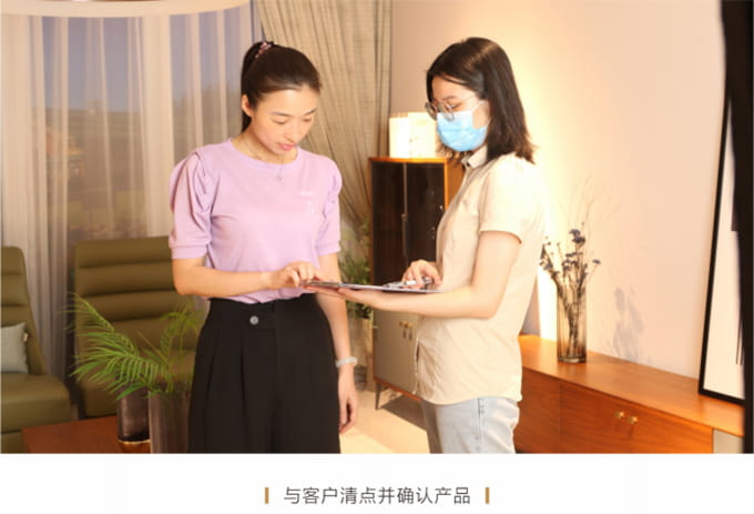 耐心解答客户提出的关于家具保养的提问,同时将OD综合体育产品使用说明书送给客户,尔后教客户如何扫描产品二维码进行防伪鉴定,请顾客对货物进行验收检查,然后正式签收《产品配送单》。